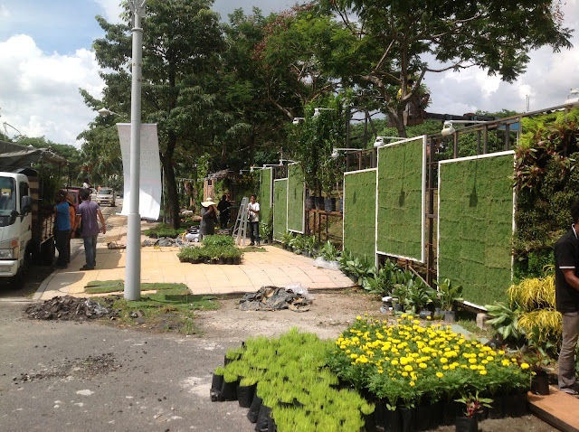 Grass panels (Zoysia spp.) Some of the Tagetes erecta (Yellow Marigold) and paddy in polybags awaited to be slotted into the wall