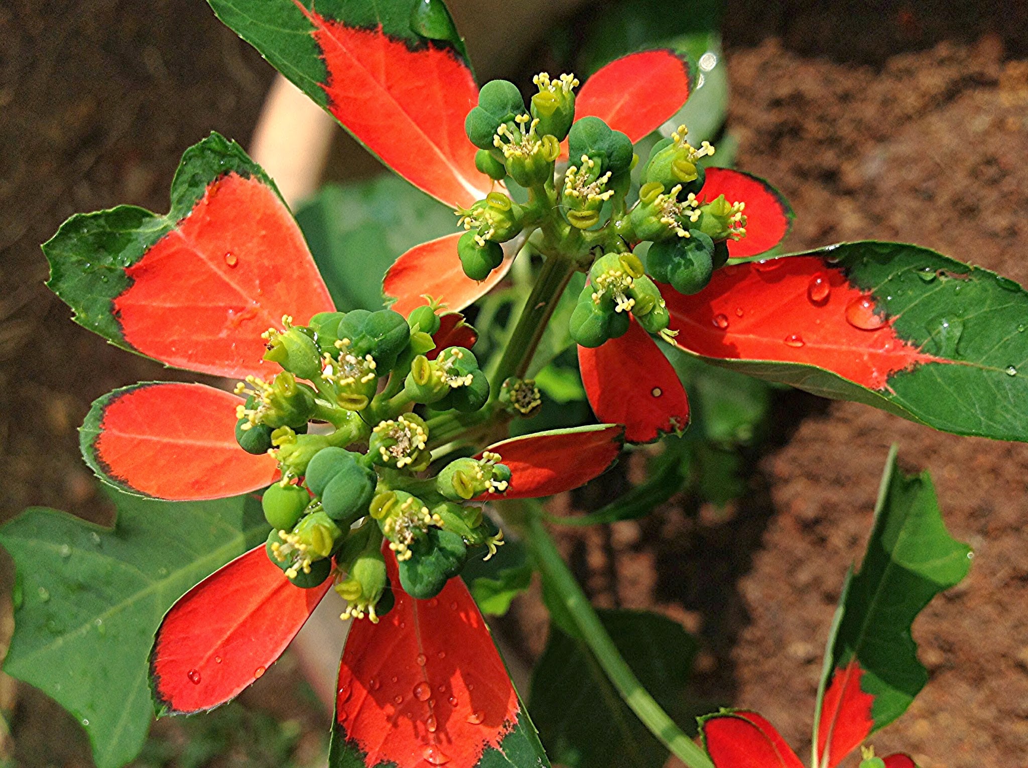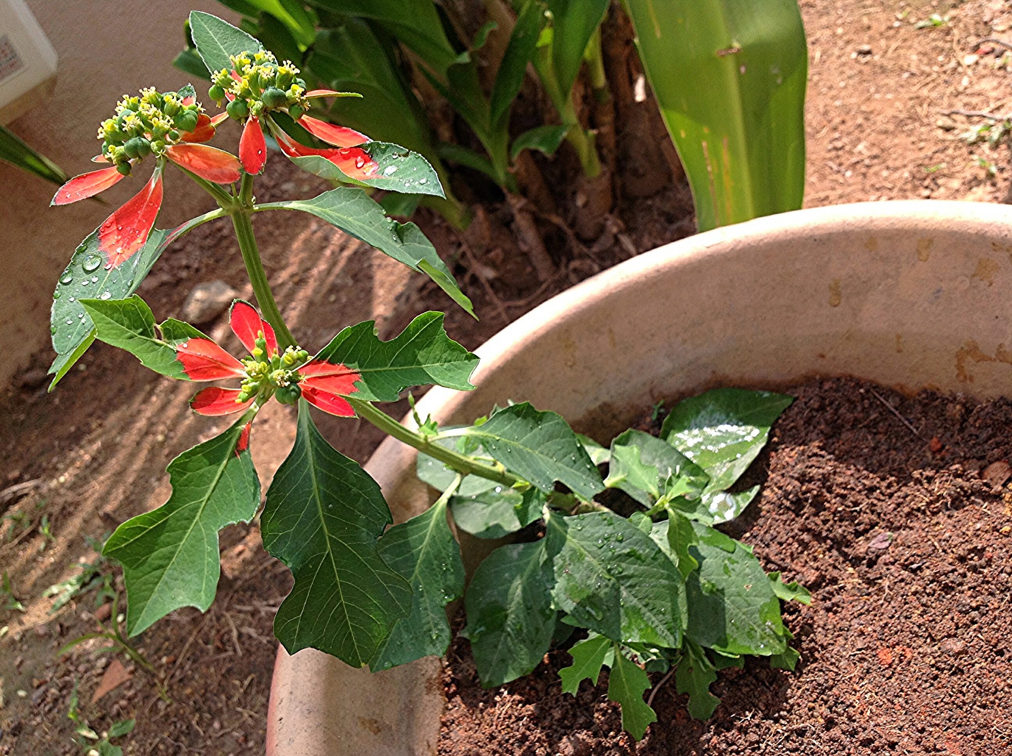 I was cleaning up fallen branches and debris in my garden yesterday and came upon this little plant with bright red flowers which really caught my attention. What is this..? I found it growing out of a crack in the drain. It looks sort of like a Poinsettia (but isn't as showy as the kind sold..).