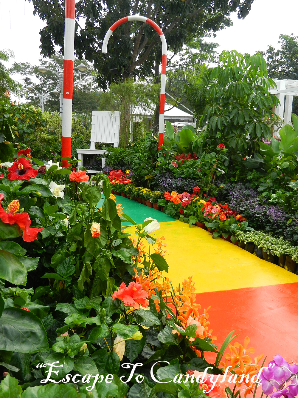Now, feast your eyes on the colourful hues of Hibiscus blossoms, bright 'candy canes' and 'lollipops'; the giant white painted chair and the mystical tree trunk in the Hibiscus garden.....Enjoy your journey!